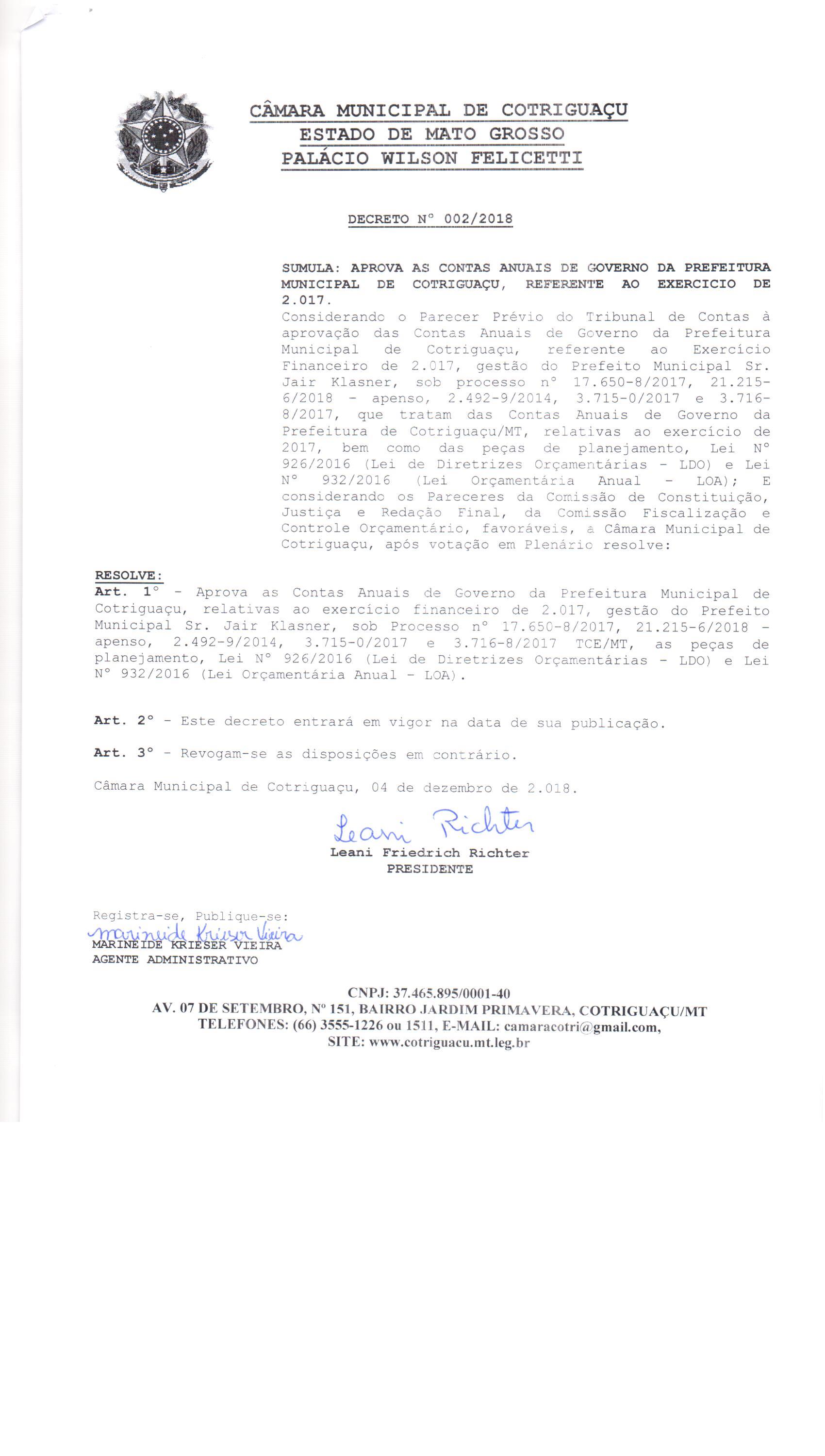 Decreto Contas Exercício 2017