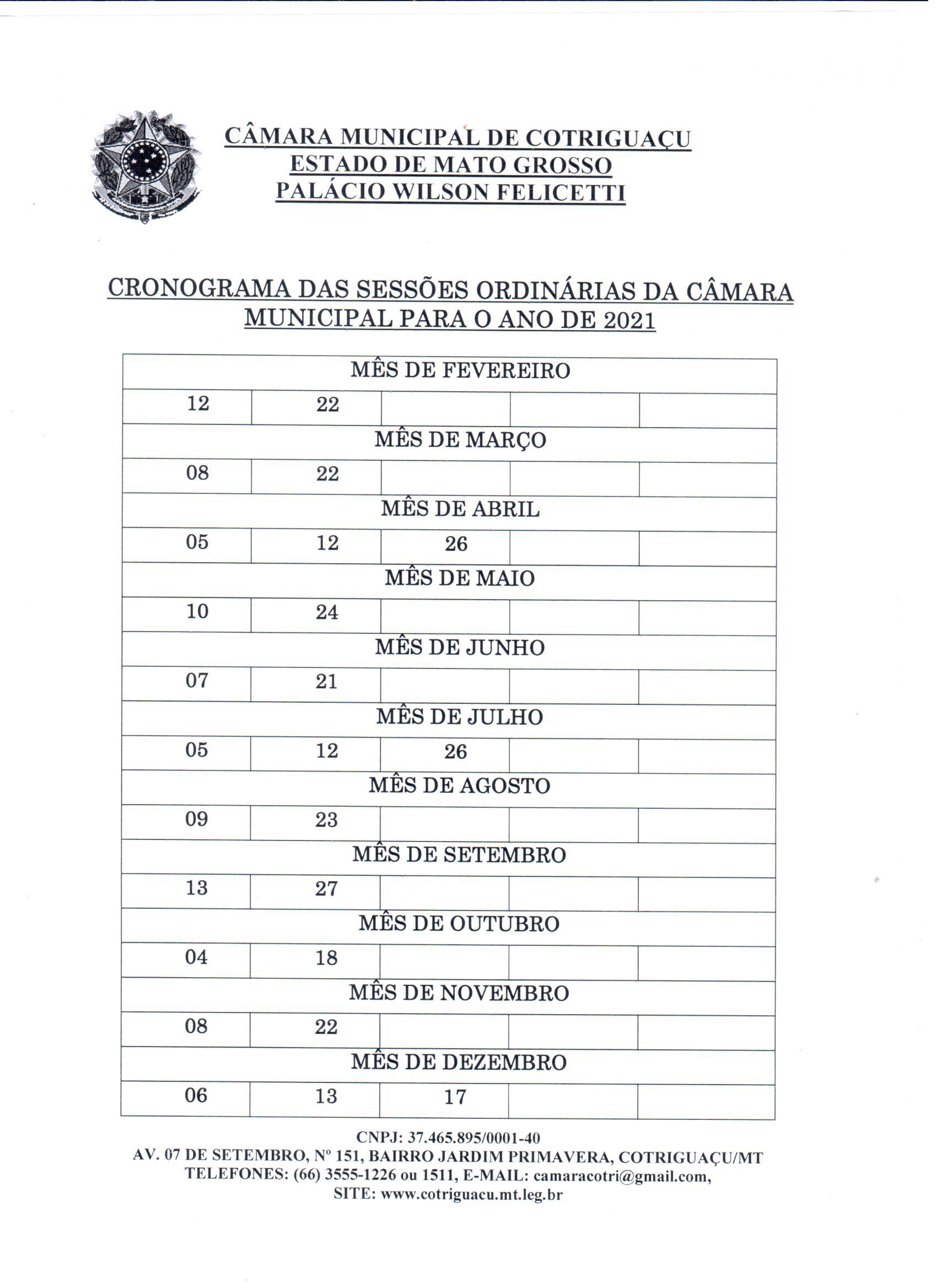 Cronograma das Sessões Ordinárias 2021