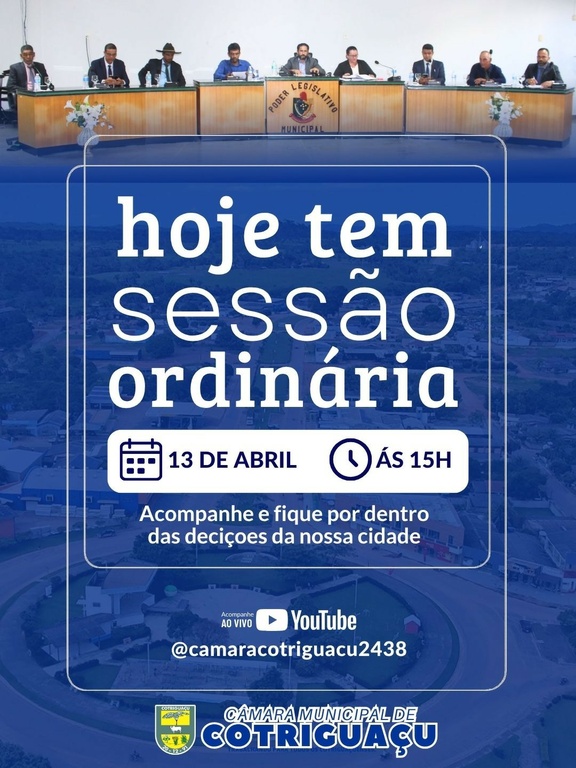 SESSÃO ORDINÁRIA HOJE! 🗓️ Nesta segunda-feira, 13 de abril, às 15h, a Câmara Municipal de Cotriguaçu realiza a 5ª Sessão Ordinária do exercício legislativo de 2026, sob a presidência do vereador Fich Vaz . 📺 Acompanhe ao vivo pelo nosso canal no YouTube 📻 E com reprise na terça-feira, 14 de abril, às 19h, pela Rádio Arco-Íris FM Fique por dentro das ações e decisões dos nossos vereadores. ✅ Não perca!